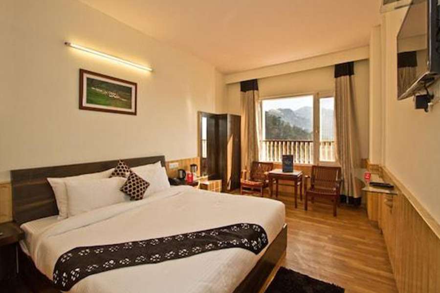 Enjoy a premium room with a private balcony offering stunning views of Jakhu Hill, perfect for a budget-friendly yet comfortable stay. The room features a king-sized bed, wooden flooring, and LCD TVs in both the sitting room and bedroom. Modern amenities include a spacious bathroom with a separate shower area, 24-hour housekeeping, in-room dining, and free Wi-Fi. Additional comforts like coffee/tea makers, laundry service, and hot water bottles in winter complete your stay.