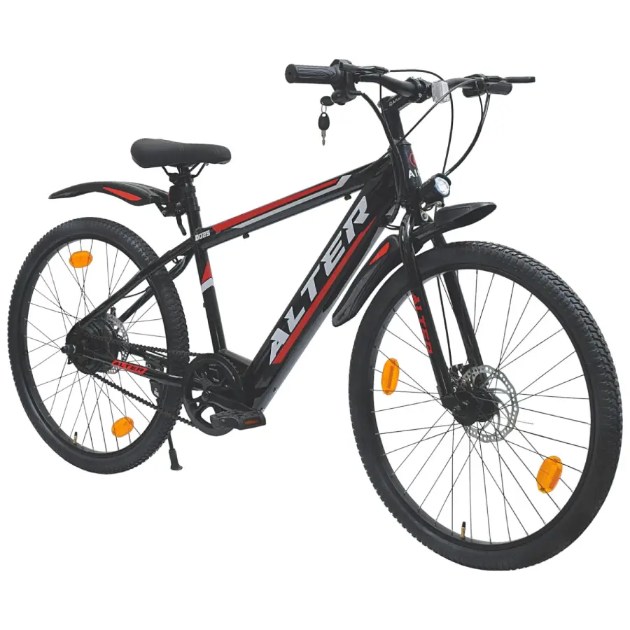 Alter 36V 250W BLDC motor, 5.2Ah BIS battery (20-25 km range), 6-magnet PAS, lens headlight with horn, metal brake levers, dual disc brakes, and steel