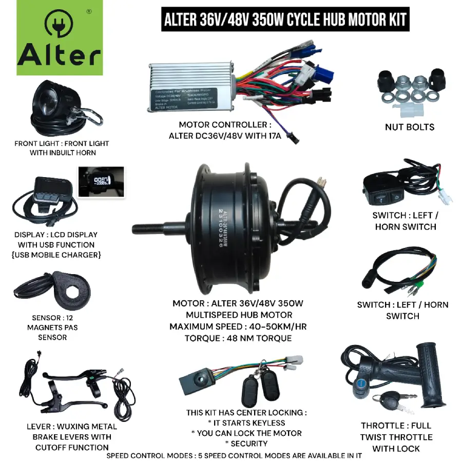 Alter 36V/48V 350W motor, 40-50 km/h speed, 48Nm torque, 17A controller, full twist throttle, front light with horn, 12-magnet PAS, LCD display
