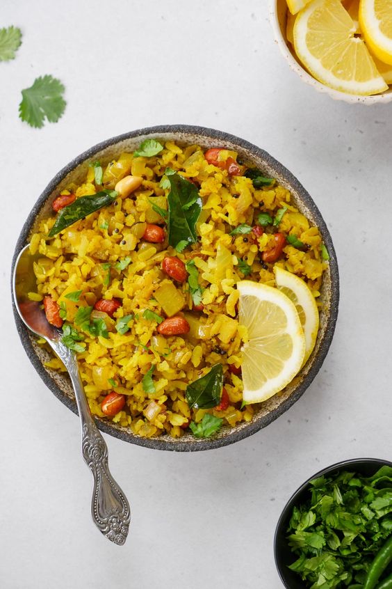 Relish the vibrant flavors of our poha, where delicate, spiced rice flakes blend with fresh herbs and crunchy peanuts for a delightful, savory